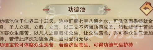 游戏中功德池的玩法有三种,先说第一种,该玩法叫做功德宝轮,这是一个类似于抽奖的玩法,该玩法中玩家可以通过转动宝轮来获得世珠,在获取了一定珠子后可以用来兑换气运。