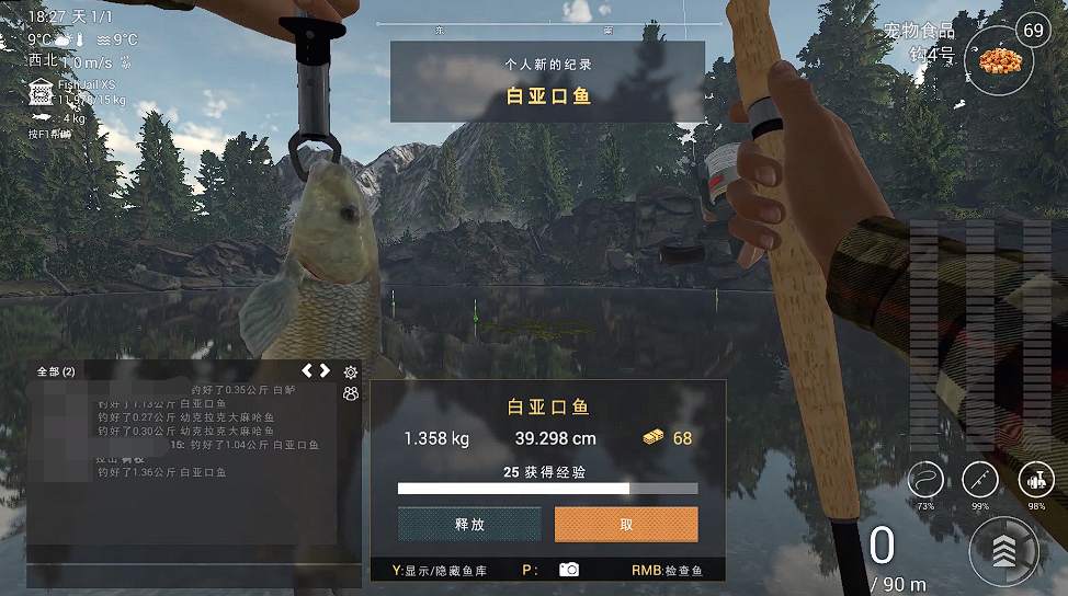 钓鱼实操上面,钓点要在湖中间的位置,而且大家应保持平稳和连贯的动作,避免快速拉动,这样可以减少白亚口鱼跑掉的风险如果感觉到鱼咬钩,需要通过控制杆来调整拉力避免鱼线断裂。在拉扯过程中可以观察鱼的动向并相应地调整钓竿的方向,以减少鱼线的压力。