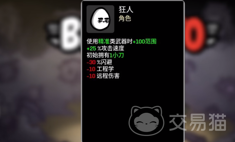狂人在游戏里主打的是近战,这个角色会自带25%的攻击速度加成,因为这种独特的特性,所以比较推荐大家选择小刀,击退敌人的同时也能增加攻击速度,如果想要限制敌人的话,那就可以选择手里剑,这个会比小刀有更远一些的攻击效果,是一个可以把角色调整成远距离作战的武器,剪刀也是比较推荐这个角色去使用的,会有一定的吸血效果,可以让玩家在游戏里持续不断的输出。