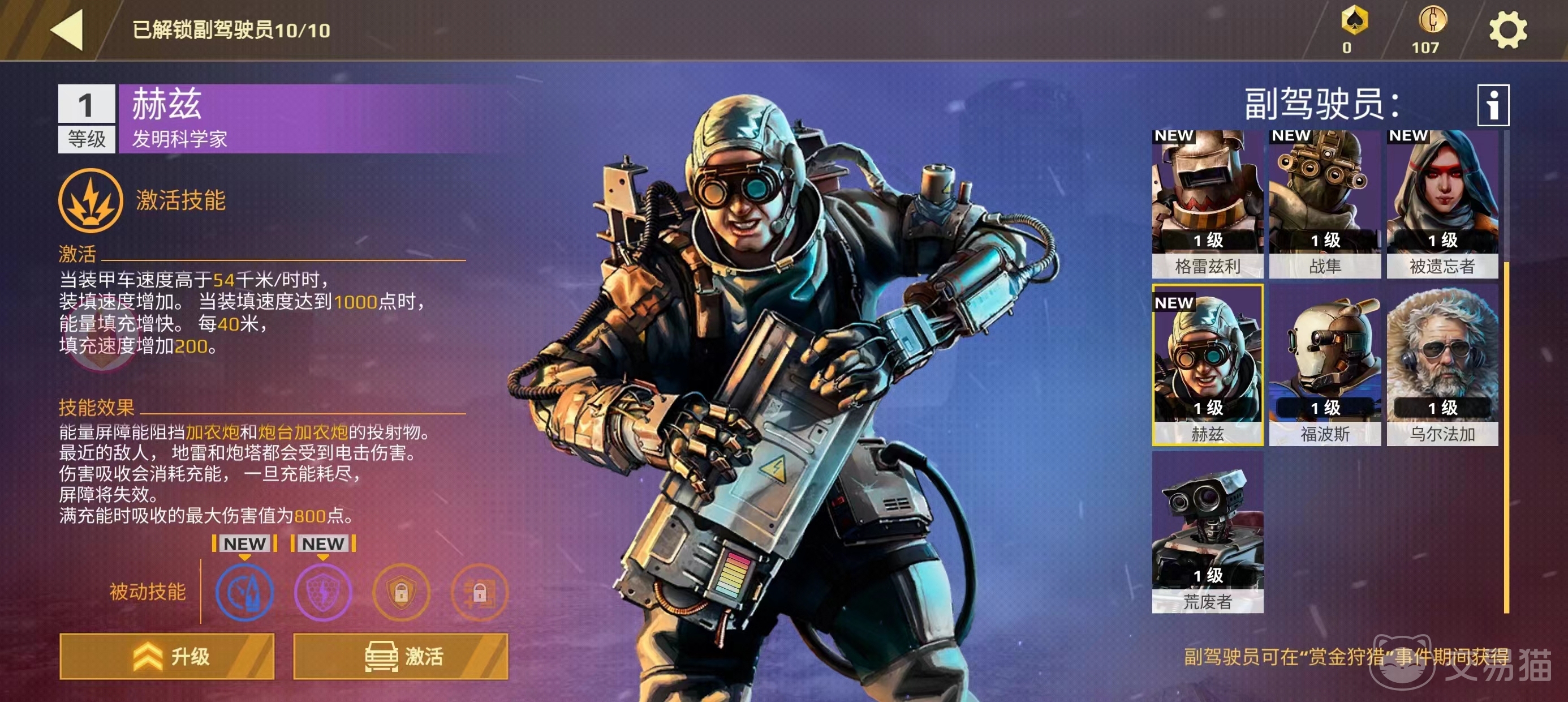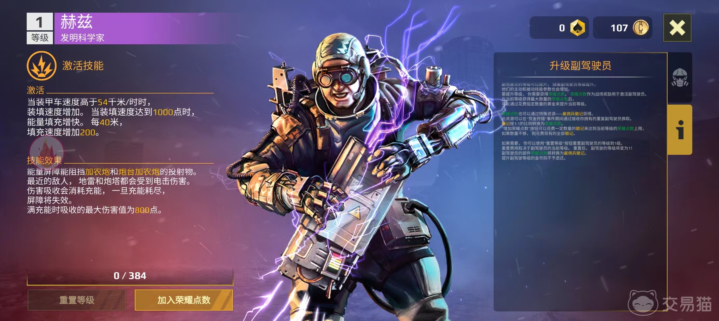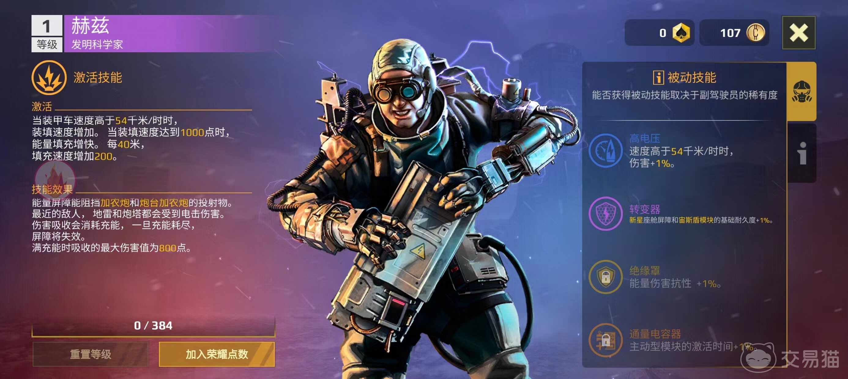 被动技能上面第一个高电压是可以在速度高于54千米/时提升伤害的,所以后期大家有被动的加成,使用赫兹作为副驾驶角色输出也不会很弱,而第二个被动即时转变器,这个技能的话就跟上面组装的部件有关,新星座舱屏障和宙斯盾模块的基础耐久度会因为这个被动效果得到提升效果。