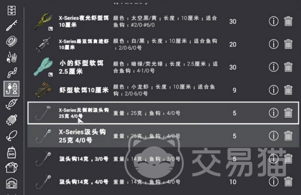 游戏里的鱼钩有许多,诸如12号钩、钩1/0号、钩10/0号、钩2号等,还有无倒刺钩、x系列的鲤鱼钩等等。不同的钩子适合钓得鱼也是不一样的,以鲶鱼为例,可以用5/0、6/0、8/0、无倒刺6/0这几种钩子来钓。