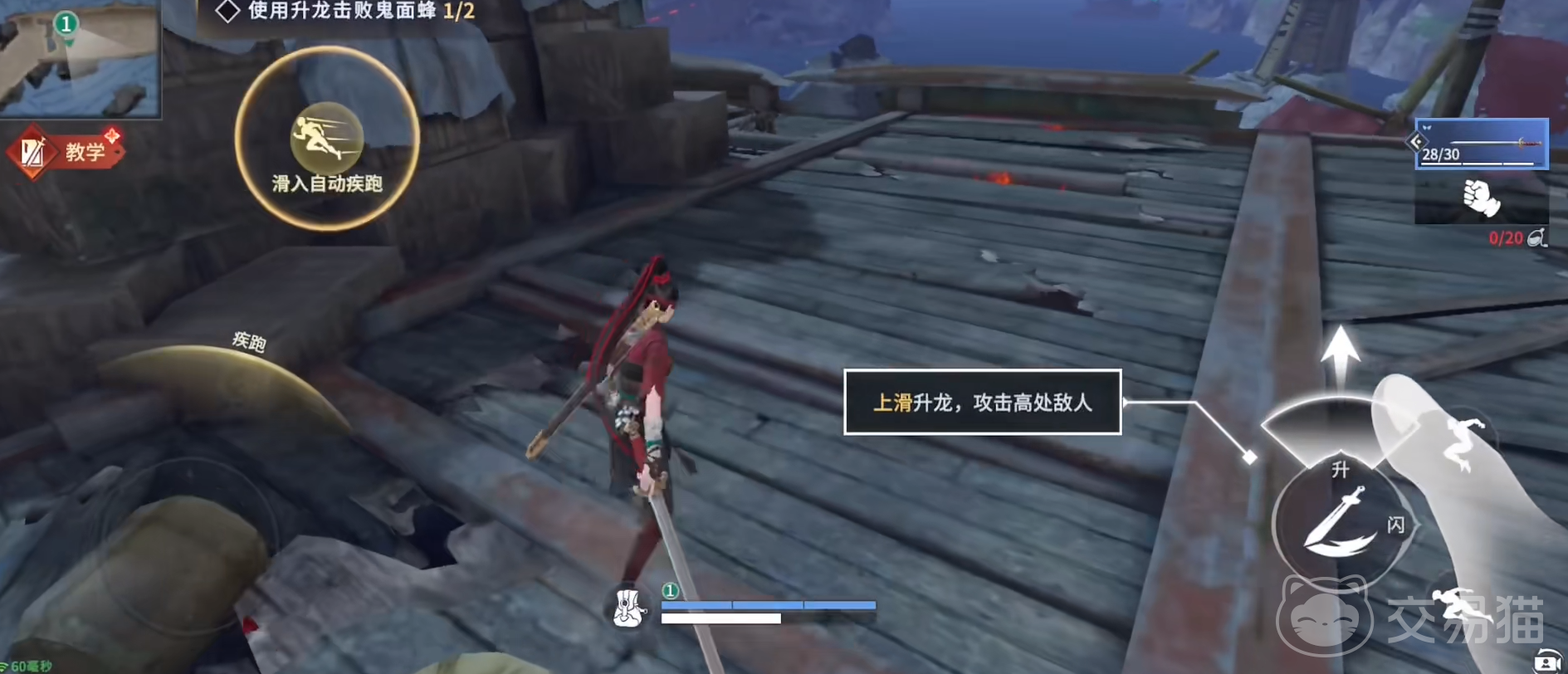 离开房间之后,这里就是指引玩家了解武器的使用和武器的装备。这里会开启自动拾取等玩法,玩家装备好武器之后就会进入战斗模式。玩家会在这里遇到阻碍自己的敌人,根据指导用升龙这个基础招式将敌人打败。