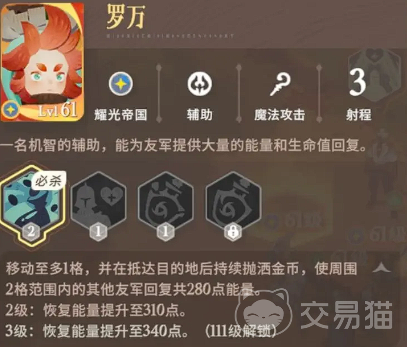 罗万,旅行商人,以辅助的身份为队伍提供支持,他的魔法攻击能够在三格范围内施展,为战斗带来转机,她的技能能恢复能量、恢复血量,可以说奶位中非常强力的存在。噜噜,叹息之力,作为坦克英雄,以物理攻击在前线抵挡敌人,他的坚韧不仅保护了队友,也为是技能强劲的英雄之一。