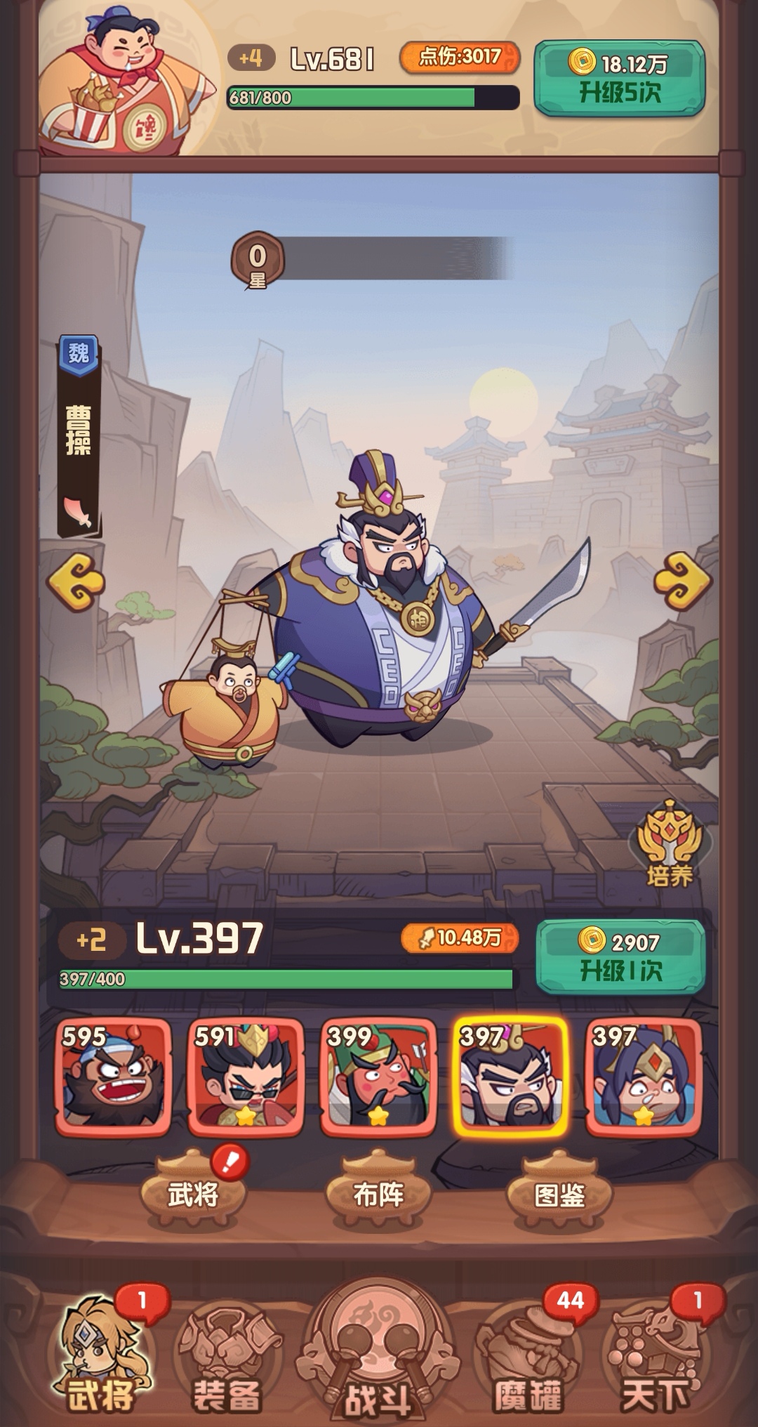 因为曹操是个攻击系的武将,在战斗中擅长的是输出,所以各位在给他搭配铭纹的时候,也要选择攻击系的铭纹套装,而像华佗这种辅助型武将,就要去搭配生命值、不屈套装等铭纹套装。事实上,前期的铭纹系统是没有解锁的,玩家需要先刷主线副本,并且多给自己升星级,到了一定数量后才可以解锁这一系统。