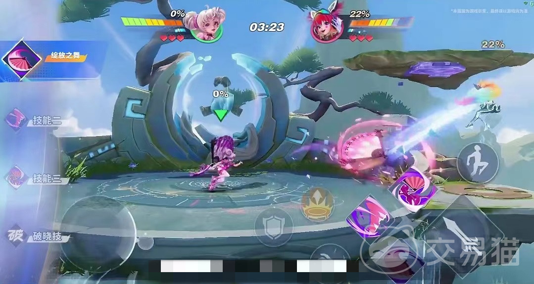 作为一名法师英雄,近身招式也只能用于应急,伤害威力最大的依然是自己的技能。一技能绽放之舞,扔出自己手中的大扇子,飞到最远距离后还会回旋回来进行二段打击,长按一技能可以使扇子体积变得更大,飞行距离也更远。作为小乔的招牌技能,一技能可以用于远距离压制,即使敌人向前跳躲避第1段伤害,后续也会受到回旋攻击,但因为此技能只能打击水平线上的对手,所以敌人通过跳板就可以进行躲避。二技能甜甜旋风,向前方扔出法球,落地后化身为一道旋风,旋风持续打击身边敌人,该技能缺点在于前摇比较长,所以只能在连招中使用,或者是用于压制敌人。
