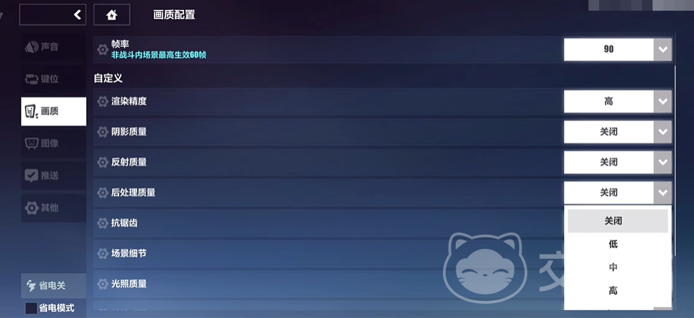 渲染精度其实就是画面的分辨率,这个地方如果手机配置可以的话尽量调高,如果配置偏低选择中度也是可以的,不建议大家将这个数据调的太低,不然角色的面容基本都是成糊状。