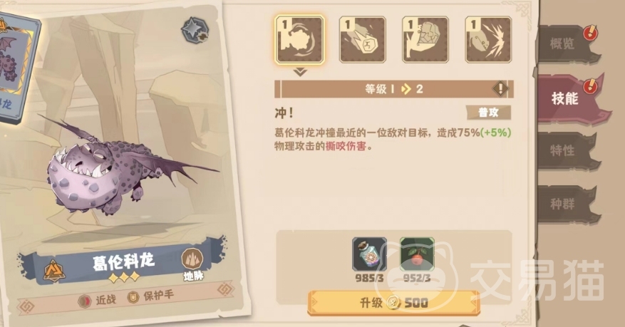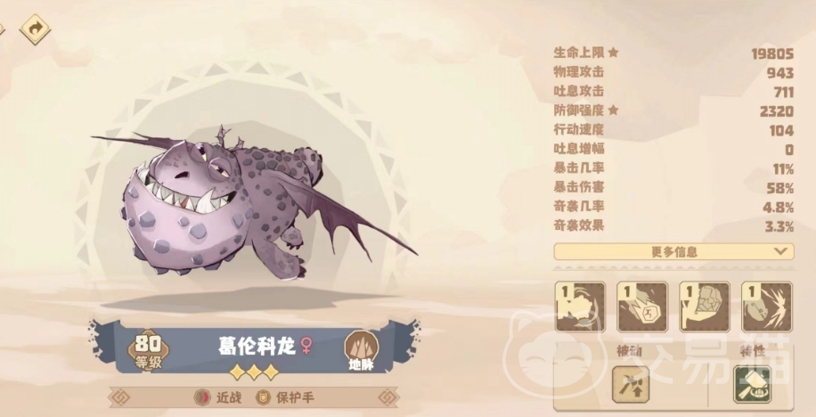 面板来看,葛伦科龙属于近战保护手,这种定位的龙往往有着非常硬的身板,从属性来看也确实如此,葛伦科龙最突出的两项属性是生命上限与防御强度,虽然前者只有接近两万的水平,但放在三星龙里面依然算得上出类拔萃,后者的话即使对比更高品质的保护手也落后的不多,所以拥有它的话,前期的承伤选择就不会纠结。