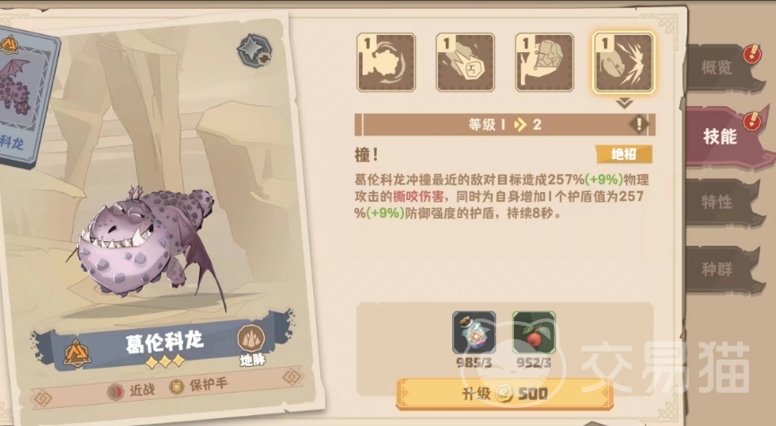 最后的绝招“撞!”则是一个单体伤害技能,使用后会造成257%物理攻击的撕咬伤害,相比它其他技能,257%的伤害倍率明显要高出不少,同时这招还会为自身增加一个257%防御强度的护盾,该护盾会持续八秒,能够帮助葛伦科龙在这段时间内挡下大部分的伤害。