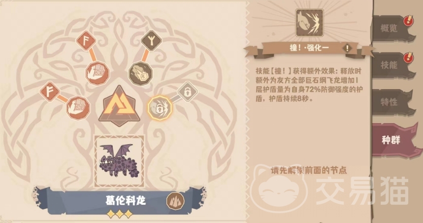 值得一提的是“撞!”这一技能还会随着种群的激活解锁其他的强化效果,这个效果主要是能够在释放时为友方全体巨石纲的飞龙增加1层相当于自身72%防御强度的护盾,也就是说如果搭配巨石纲的话,那么队伍的整体坦度都会提升许多。
