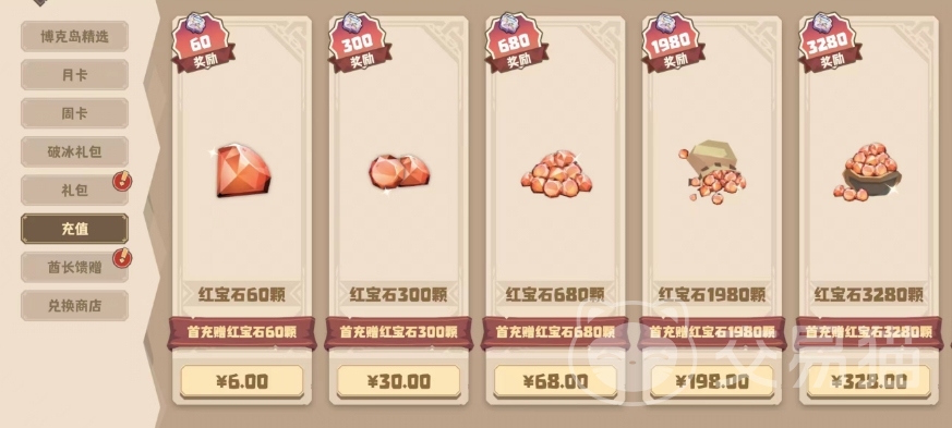 氪金获取红宝石的方法也有好几种,第一种最直接,就是充值获取红宝石,直充的话是1:10的比例,1元可以充值10个红宝石,首充的话还有100%的红宝石返利。