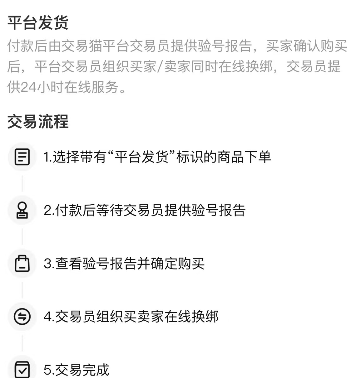 交易猫的靠谱体现在它的交易流程上面,购买成品号只需要5个步骤,每个步骤都有严格的手续规定,必须完成既定动作以后才能进入下一步。比如下单以后必须先验号再交易,只要买家对验号结果不认可,就能立即停止交易。同时它还支持平台发货模式,第一次在交易猫上购买账号的小伙伴选择这个模式交易,跟平台的人员对接交易更加安全更加放心。