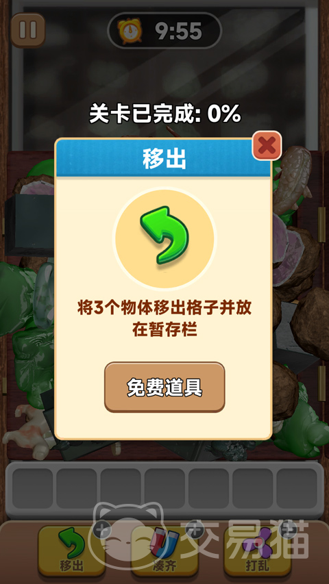 除了自己找出来一样的东西之外,小伙伴们还可以通过道具帮助自己过关。比如移除,如果大家屏幕上已经觉得没有什么可以共同消除的东西就可以选择用这个道具把屏幕上的三个物体移出去暂存。