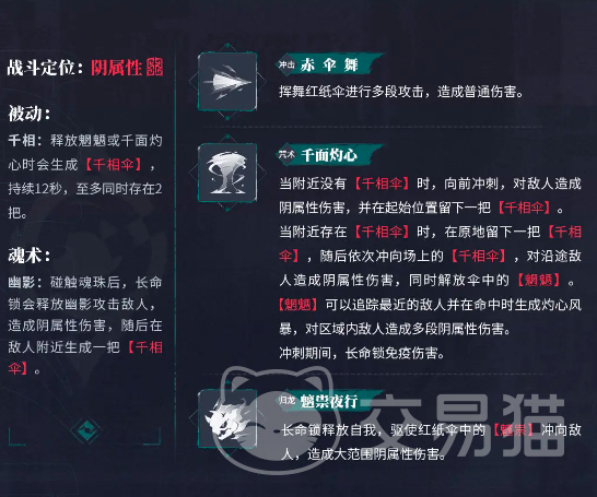 长命锁的被动是释放魍魉或者是千面灼心的时候,会生成千相伞,持续时间是12秒,而且同时可以存在2把。她的魂术幽影可以在触碰到魂珠之后,然后释放出幽影攻击敌人。之后在敌人的附近还会生成一把千向伞。