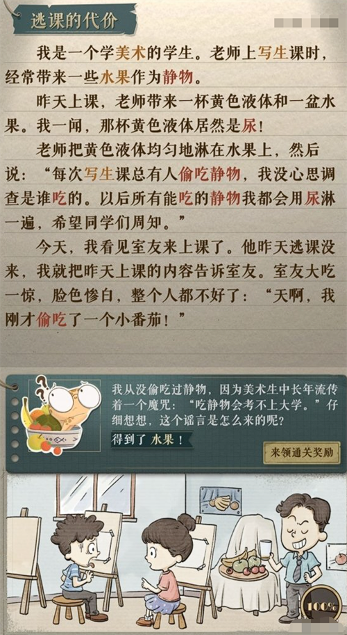而在“逃课的代价”关卡中,玩家将面对的是一个关于青春和选择的故事。这个关卡要求玩家理解人物的动机和后果,从而找到通关的线索。如下图所示: