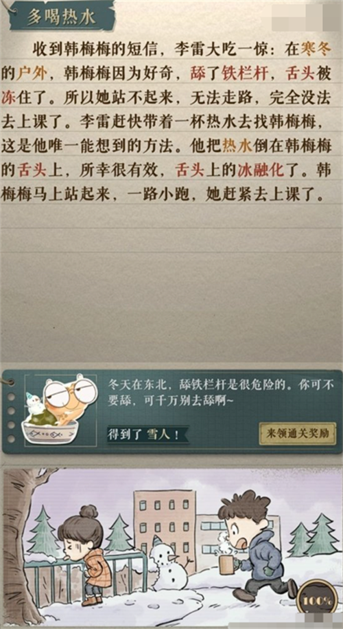 先来到“多喝热水”关卡,这里的谜题是围绕日常生活展开的。玩家需要注意的是,游戏中的提示往往隐藏在最不起眼的地方。在这个关卡中,玩家需要关注对话中出现的频率较高的词汇,这些往往是解谜的关键。如下图所示: