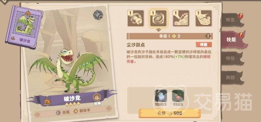 普攻和一技能可以一起说,前者就是一次单体撕咬伤害,下限和上限都与大多数龙一致,一级能吃到75%的物攻加成,满级则能够吃到120%的物攻加成,解锁种群后也没什么特殊的,并不会强化。