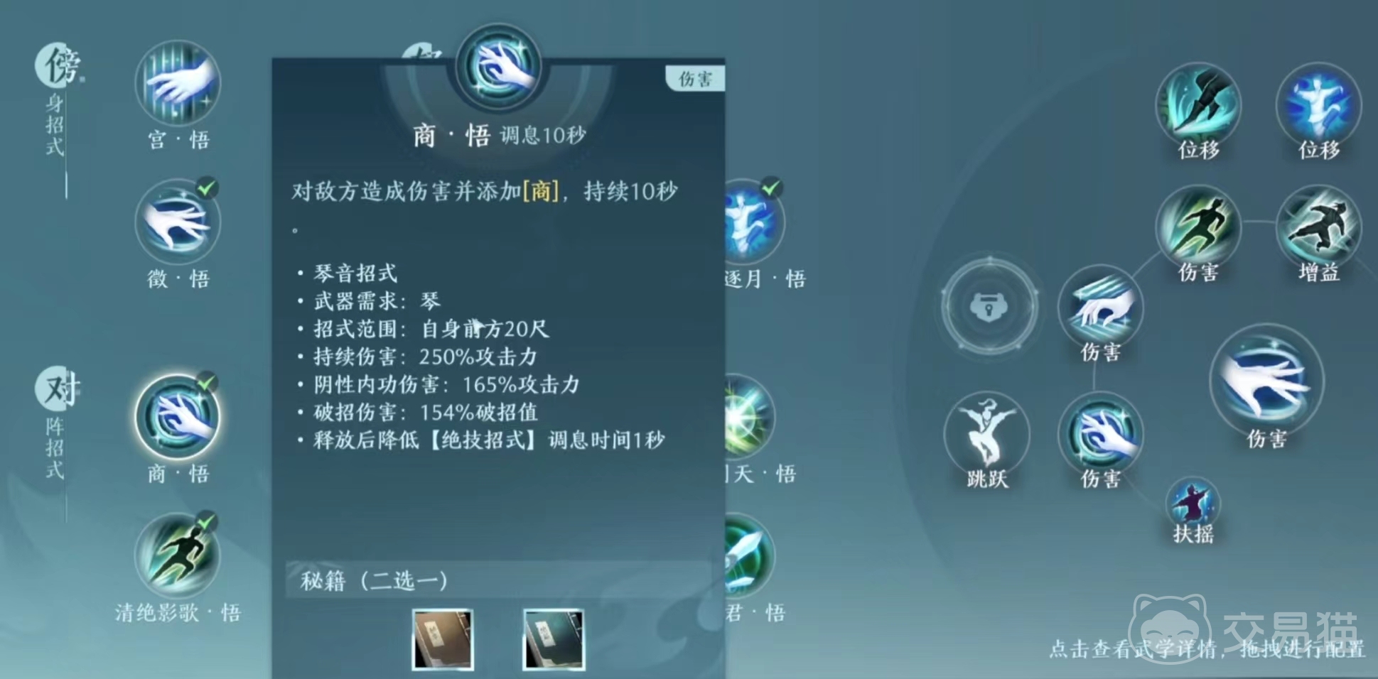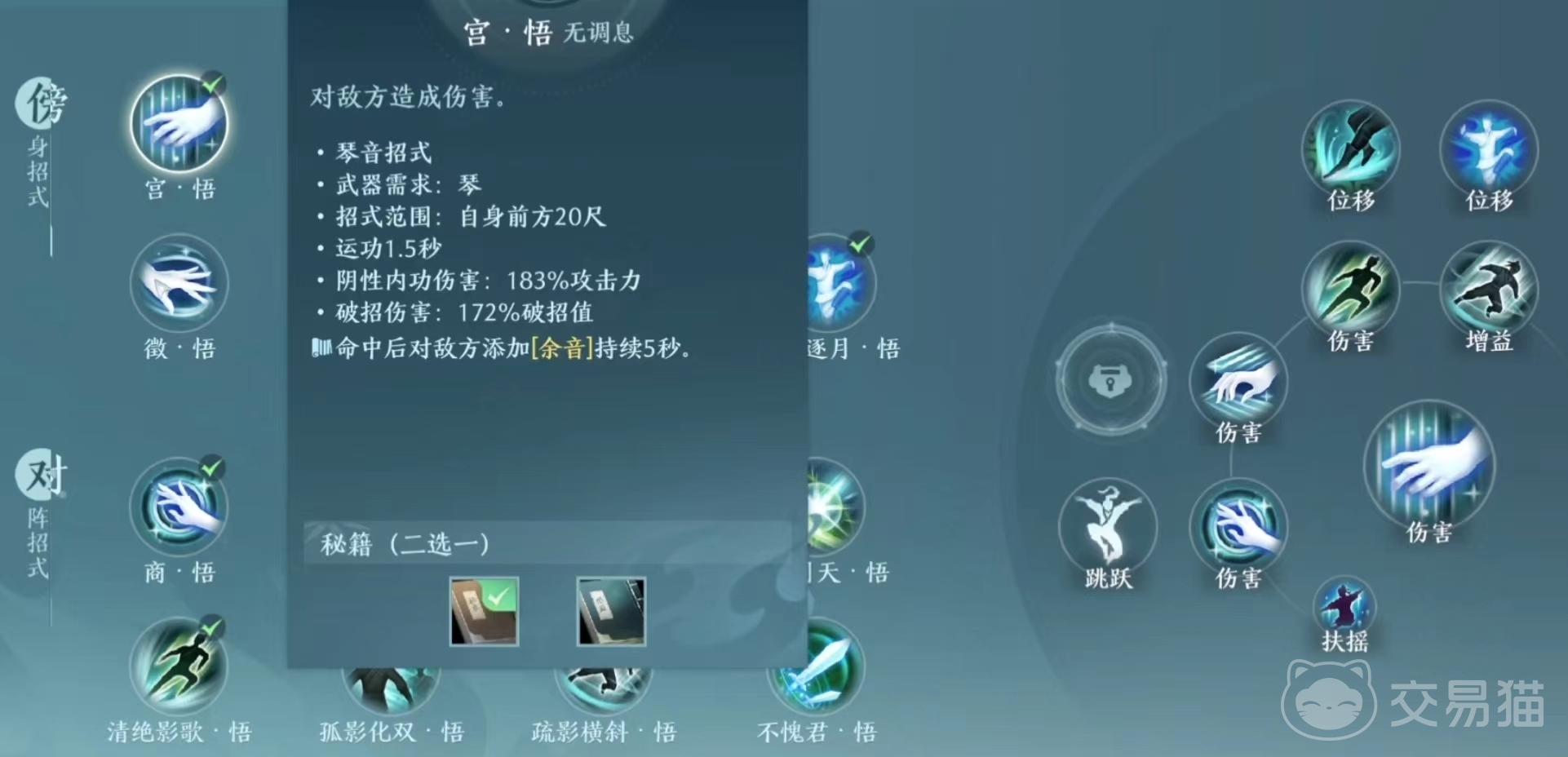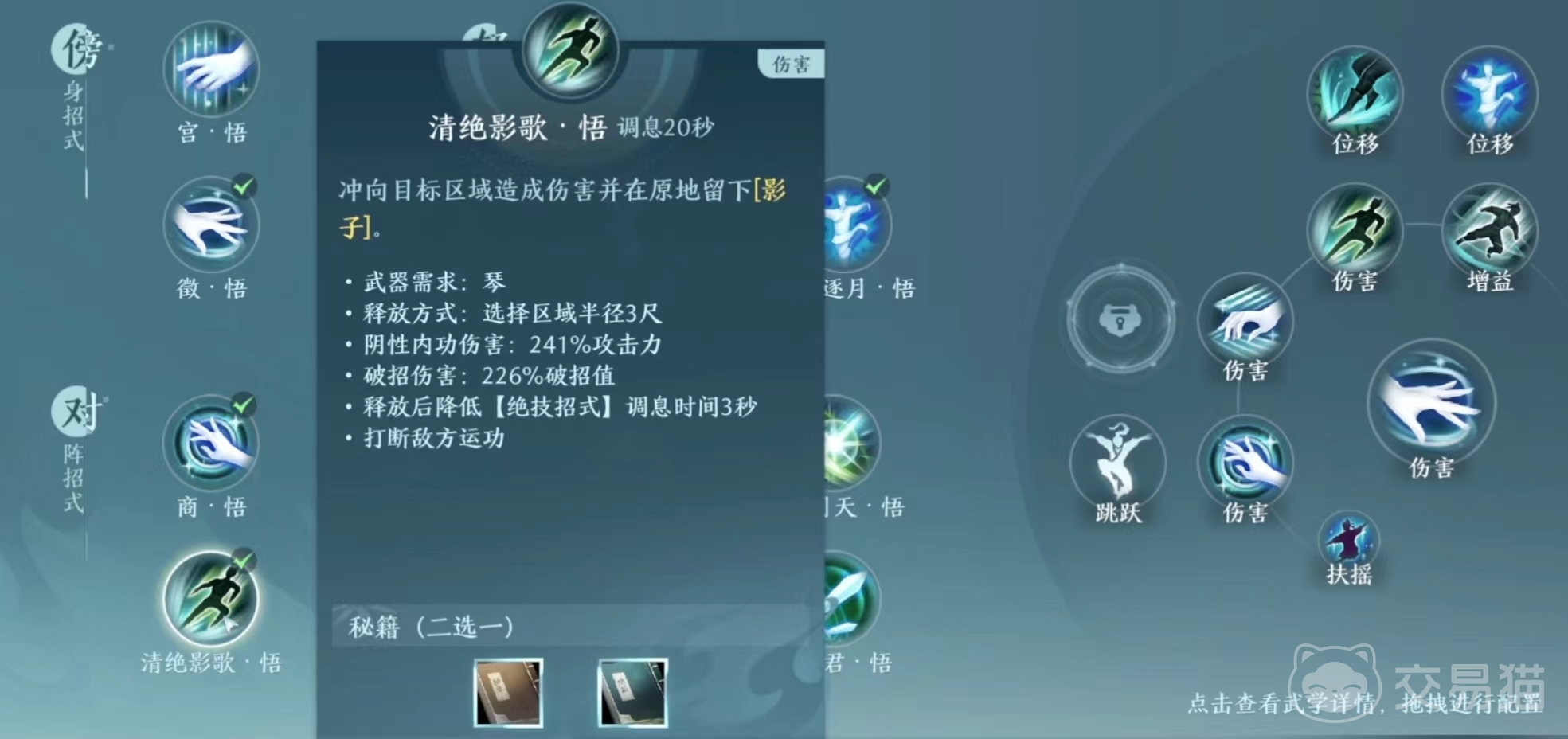 云生结海这个技能可以让玩家创建一个半径五尺的音域,只要在这个音域范围里面的敌人都能够受到伤害,效果将会持续五秒钟的时间,清绝影歌技能也是对阵的招式,使用这个招式的话,,这个攻击的区域变为半径三尺,玩家可以直接冲向目标区域,并且对敌方造成伤害,同时能够打断敌方运功,还会在原地留下影子。