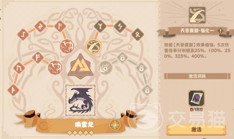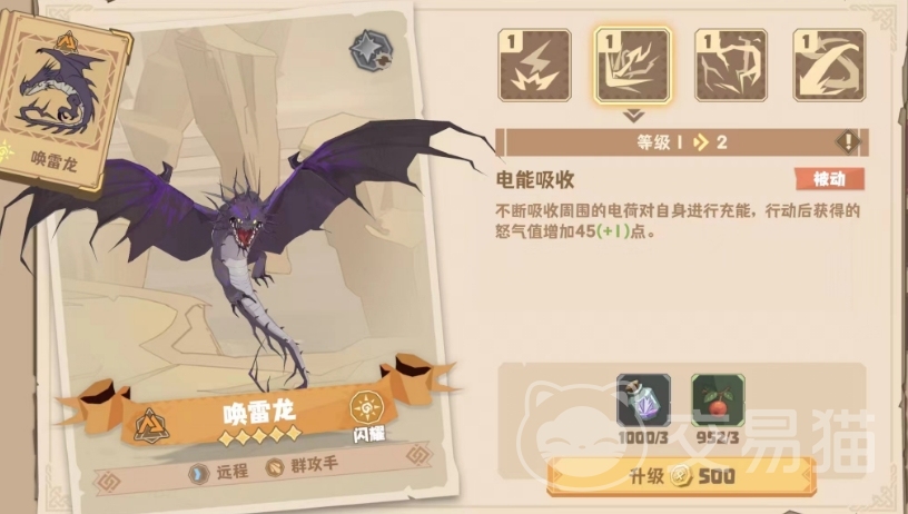 唤雷龙的一技能不是伤害技,而是一个补充类的技能,使用后可以通过吸收周围电荷对自己充能,表现在战斗中就是增加自己所获得的怒气,一级情况下可以增加45点,满级的话则可以增加55点,如果激活了种群,那么该技能增加的怒气还会进一步得到提升。