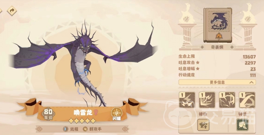 从属性来看,唤雷龙的生命上限是劣势,这意味着它没法在承伤层面有太好的表现,不过相对的,它的吐息攻击和吐息增幅却都比较高,这两项属性都关乎进攻,可以让唤雷龙在普攻和技能上表现出更高的伤害,结合它本身远程群攻手的定位,这种属性优势还是显得挺受用的。