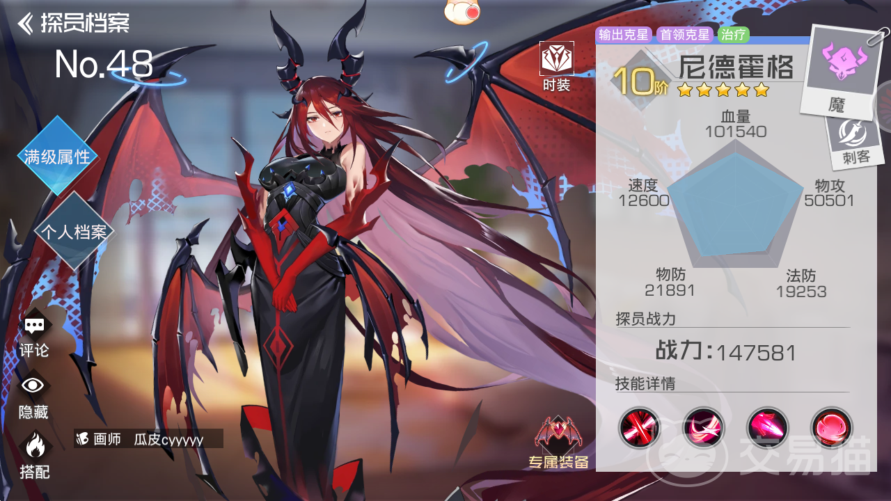 尼德霍格:她是游戏内的刺客角色,有着超高的物攻和速度,技能也都吃到高倍率的物攻加成,同时技能还可以减少敌人攻击,并能锁定敌人攻击最高的C位进行突袭,此外它还能吸取敌人前排血量,并能治疗自身的队友。