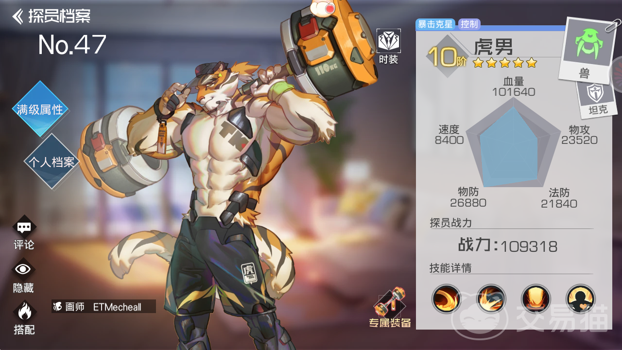虎男:非常肉的一个兽族坦克,拥有高额的物防面板,不过物攻比较低,这点在技能上也是有一样的体现,它最出色的是被动技能,可以让虎男血量越多,双抗就越多。