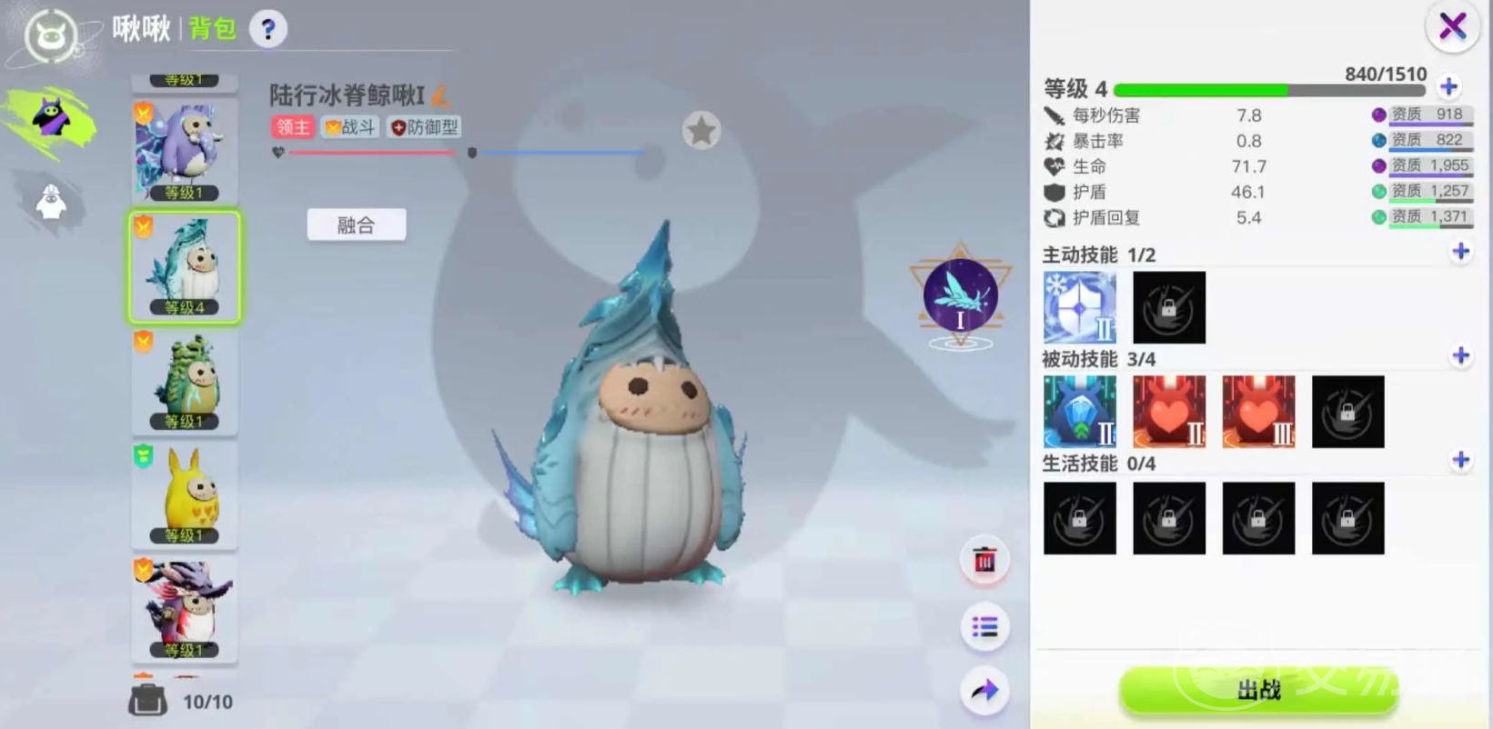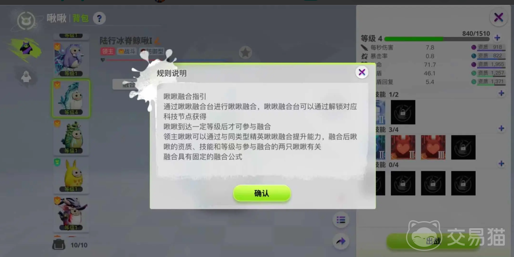 当然在融合的时候因为技能可能会发生一定的变化,所以一定要学会合理的技能搭配,比如说融合脊鲸啾啾,需要选择好两只基础宠物,想要合成一级的啾啾,需要一只26级的陆行冰脊鲸啾以及10级土菇犀牛啾,选择好基础宠物之后用啾啾融合器在线融合即可,大概需要等待30分钟时间就可以将其融合成功。