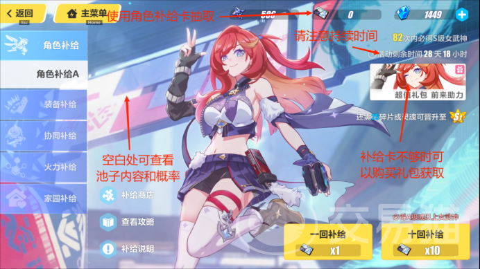 下面要着重给小伙伴们介绍的是新手补给,这是只有新手玩家才会有的福利,大家可以用角色补给卡和装备补给卡抽,能从里面获取两个角色以及适合他们的装备,不过这个卡池的时间是有限制的,时间结束之后不会再次开启,所以新的小伙伴先尽量把这个卡池给抽好,再考虑抽其他的卡池。