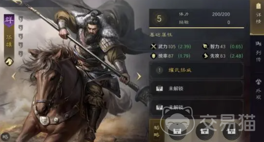 在游戏当中华雄拥有超高的武力成长和武力值,是典型的兵刃输出武将,搭配特定的战法之后可以给敌人造成大额的伤害,耀武扬威是该武将自带战法,可以对自身造成技穷,从而给敌人发起连续性普通攻击和兵刃伤害。另外角色的控制力和防御力也十分的优秀,在团队当中起到很关键的作用。