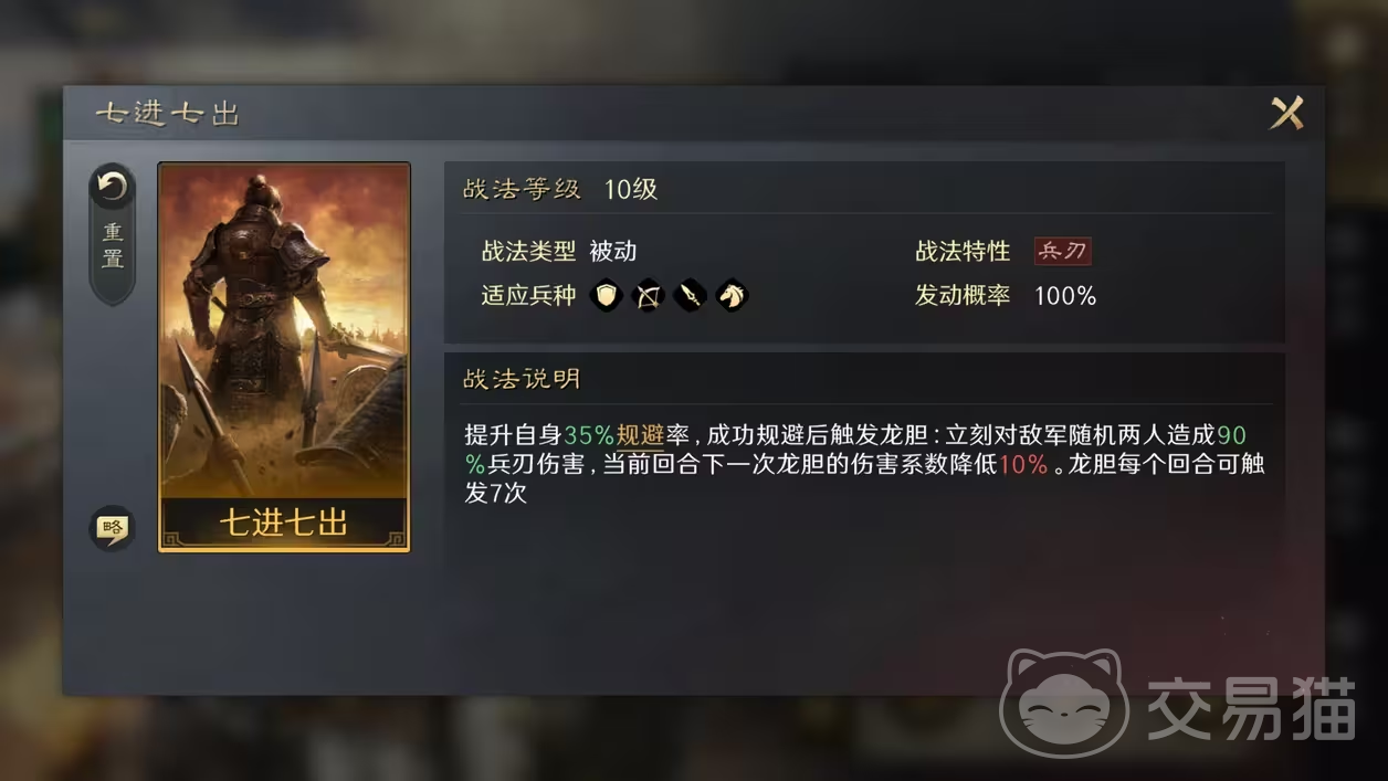 赵云是蜀国的一名橙色级别武将,他的兵种是骑兵,赵云拥有很强悍的前排抗伤能力,他的技能使他拥有高额的规避能力,每当遭受到敌人进攻的时候有百分之三十五的几率可以规避掉本次伤害,并且一旦规避掉伤害就会给敌人施加上一次百分之九十武力值的物理伤害,每个回合都可以最多触发七次,遇到像李儒这样打多段伤害的敌人很容易触发多次规避直接秒杀敌人。