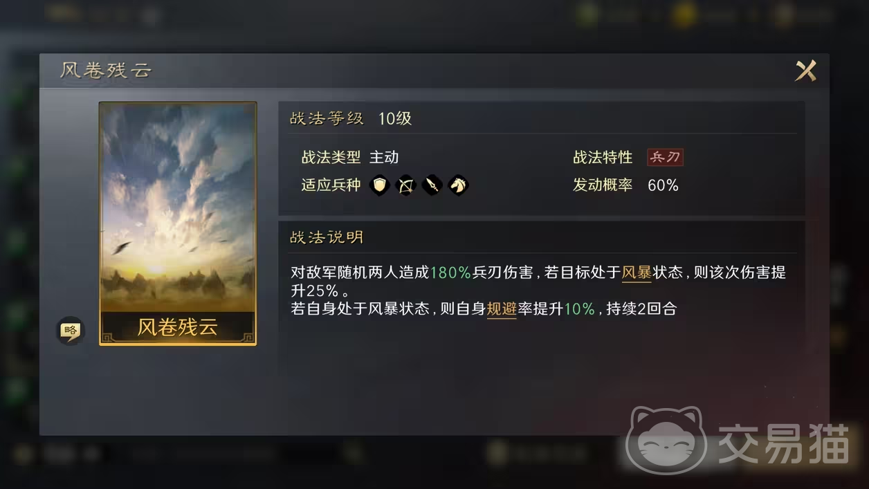 对赵云而言,最重要的就是规避属性,在一回合内只要没有达到七次以上,规避的次数越多就越有利,而风卷残云就能契合这一属性,该战法可以对敌方两人造成伤害,同时使其或者使自己进入风暴状态,如果敌人处于该状态赵云对其有百分之十的增伤,如果是自己则再提升百分之十的规避率,后期赵云的规避率已经很高了,再搭配上这个战法可以说是锦上添花。