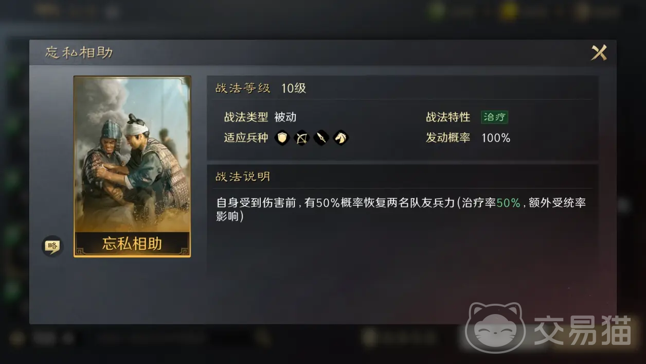 这个战法适用于赵云担任队伍辅助的情况,该技能可以使自己在遭受己方攻击之前有概率治疗自己的两名队友,搭配上前面的坚如磐石战法能给队伍增加很强的治疗能力,并且还能一边回击一边治疗,搭配上关于或者张飞,既有输出也有回复,能在PVP战场上发挥出很亮眼的效果。