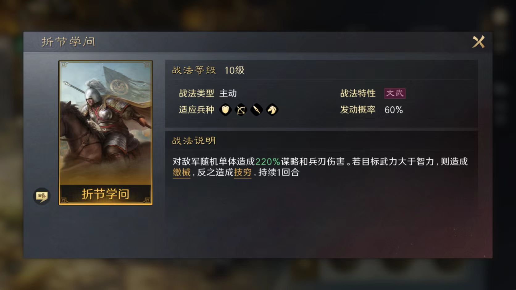 该战法不仅有高额伤害,而且还会必定增加控制状态,虽然不可完全控制,但是在大多数情况下依然可以发挥出完美效果。这两个状态都是控制类型,但是效果完全相反,技穷施加之后令敌方无法释放主动技能,缴械效果是无法进行普通攻击,这样对敌方主力输出是很好的限制。徐庶还有自己专属的金色韬略,第一个仗剑行,在战斗开始时按照智力35%提升武力值,在造成谋略伤害后,下一次兵刃伤害提升40%。另一个文攻,自带战法造成的兵刃伤害会转化为谋略伤害,并且伤害提升10%,这两种金书如何选择,还要根据自身定位及阵容来确定。