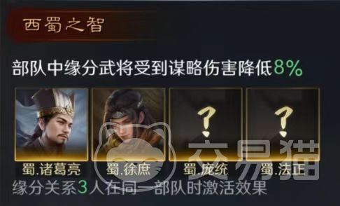 在搭配方面,徐庶主要和蜀国诸葛亮、庞统、法正等组成搭配,他们之间能够激活缘分,降低武将受到的谋略伤害。除此之外,也可以选择和袁绍、董卓一起组成搭配,在这一套阵容中,董卓也属于武力和智力双高的武将,和徐庶属于同一类型,这样在搭配上袁绍独特战法机制,这两人都可以打出更高的伤害输出。战法搭配方面,徐庶选择束手无策和文治武功,董卓可以搭配上坚如磐石,以静制动,袁绍去选择披坚执锐和青囊急救。