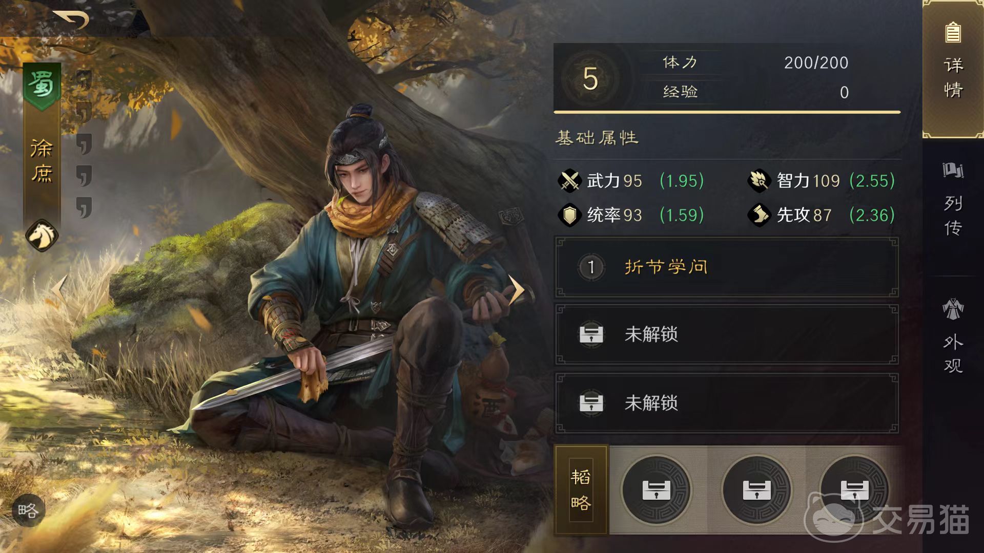 徐庶是属于蜀国阵营的橙色骑兵武将,自身在属性方面很有特点,武力和智力这两项都较为突出,其中智力属性成长尤其出色,可以带来兵刃和谋略这两种伤害类型。自带战法折节学问,属于主动战法类型,会对敌人随机单体目标造成谋略和兵刃伤害,如果目标武力值大于智力值,则造成缴械,如果智力值大于武力值,则造成技穷,持续一个回合。