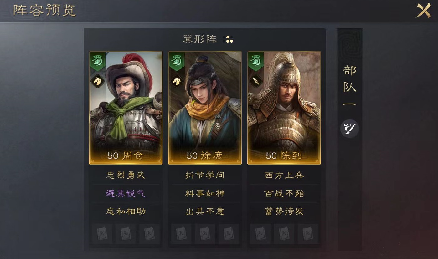 如果大家感觉董卓和袁绍较难培养,还可以选择周仓、陈到这样的搭配方式,周仓和陈到都很容易就能抽到。这一套阵容中,徐庶高智力特点可以作为主要输出手段,利用陈到自带战法,让徐庶可以获得减伤以及恢复等效果,周仓拥有极高防御,能够在前排抵御伤害,以及为敌军施加控制状态,也是比较妥善的选择。这里徐庶的战法变为了文武双全和束手无策,陈到去选择指点乾坤和清风驱疾,周仓搭配上铸甲销戈和坚壁清野。