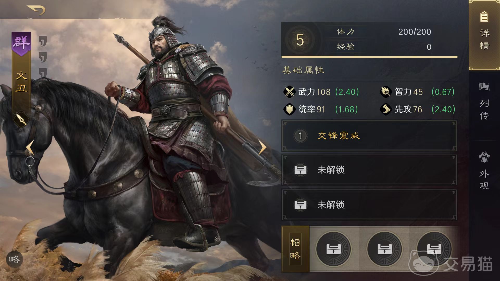 文丑同样属于群雄阵营枪兵,在属性方面和颜良极其接近,自带战法同样是追击,在普攻之后获得必中状态,可以选择敌方兵力最少单位造成兵刃伤害,文丑在获取方式方面也和颜良相同。获得自身专属金色韬略后,可以在自己和武力值最高的友军发动追击战法时,降低受到的伤害,可叠加两次持续两个回合。