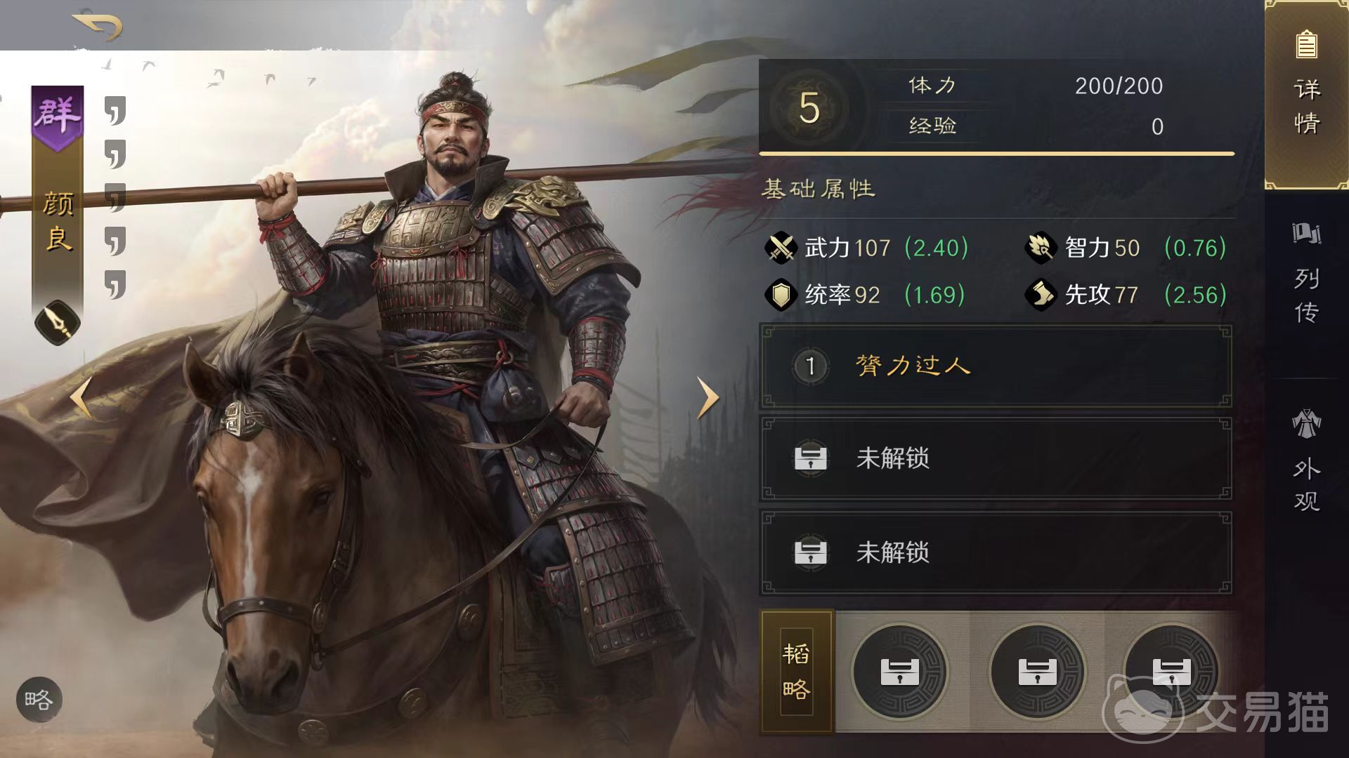 首先来介绍一下颜良,属于群雄阵营枪兵武将,拥有较高物理值和先攻值,是目前比较优秀的输出型武将,如果能搭配上特定战法,打出的伤害是非常可观的。其自带战法属于追击类型,造成普攻后可以在对敌方目标造成一次追击兵刃伤害,如果当前输出的目标武力值低于自身,还有额外伤害附加。颜良获取方式除了在普通卡池中寻访之外,还可以在兵临城下霸业阶段,通过群雄逐鹿卡池来定点获得。颜良专属金色韬略为武上,可以提高自身和另外一名武力最高的友军追击战法伤害,提高破甲属性。