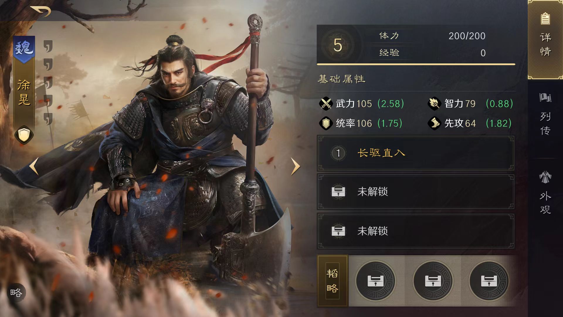 徐晃和许褚同样为魏阵营,徐晃兵种为盾兵,虽然也有突出武力属性,但并不属于兵刃输出,而是属于强攻类型。自带战法长驱直入,属于主动类型,在造成伤害的同时为对方施加技穷效果,持续一个回合。如果目标已经带有技穷状态或者是输出单位为敌方兵力最低目标,则该次伤害获得大幅提升。这样强悍的输出,可以弥补自身在防御方面不足的问题,专属金色韬略破军,提高主动战法伤害和破甲属性。