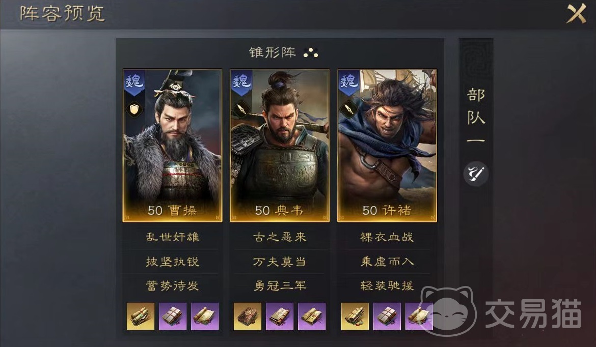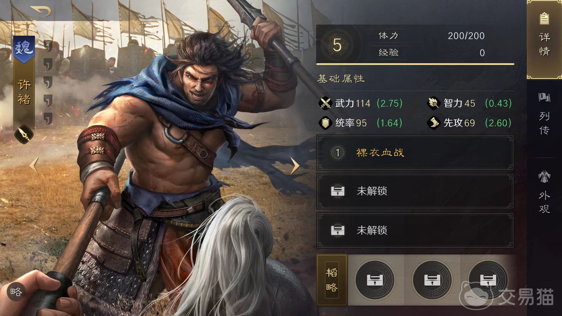 先来介绍一下许褚,许褚属于枪兵类型,基础武力成长出色,属于兵刃输出型角色,自身在先攻成长方面也很优秀,能够在战斗中率先出手,发挥出战法威力。自带战法裸衣血战,属于被动类型,在战斗开始之后直接提高自身先攻和武力,连击率提升100%,降低统率。自身还拥有专属金色韬略效果,征南卷宗提高追击战法发动机率和追击战法伤害,战书在战斗前三个回合提高自身会心机率。