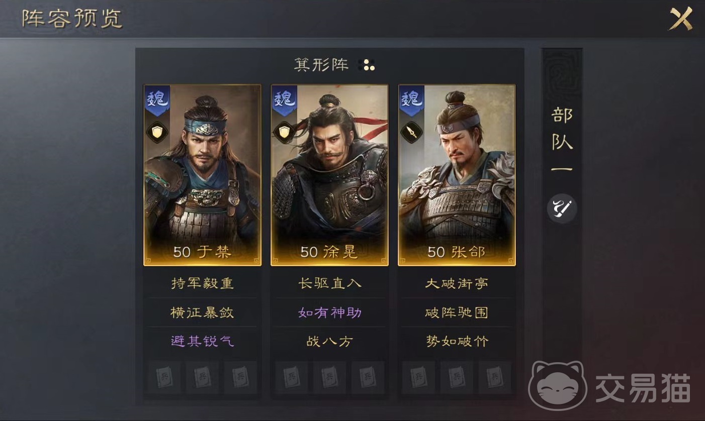 后期依然建议分开使用,这样可以拉出两支强势的输出队伍,许褚最推荐的就是上面所说的和典韦、曹操一起出战的。许褚选择攻其不备和趁虚而入这两个战法,在加点方面采用全武力加点。这样的配合好处是利用曹操的乱世奸雄,提供整体减伤效果,让许褚和典韦能够更好地存活下来输出。典韦在前排吸引进攻,这让许褚即使降低了统帅率,依然不用担心快速倒地。徐晃可以选择和于禁、张郃一起出战,徐晃选择水淹七军和斩将夺旗这两个战法,利用于于禁、张郃缴械限制对方,徐晃施加技穷阻止敌军发动主动战法,实现良好控制。