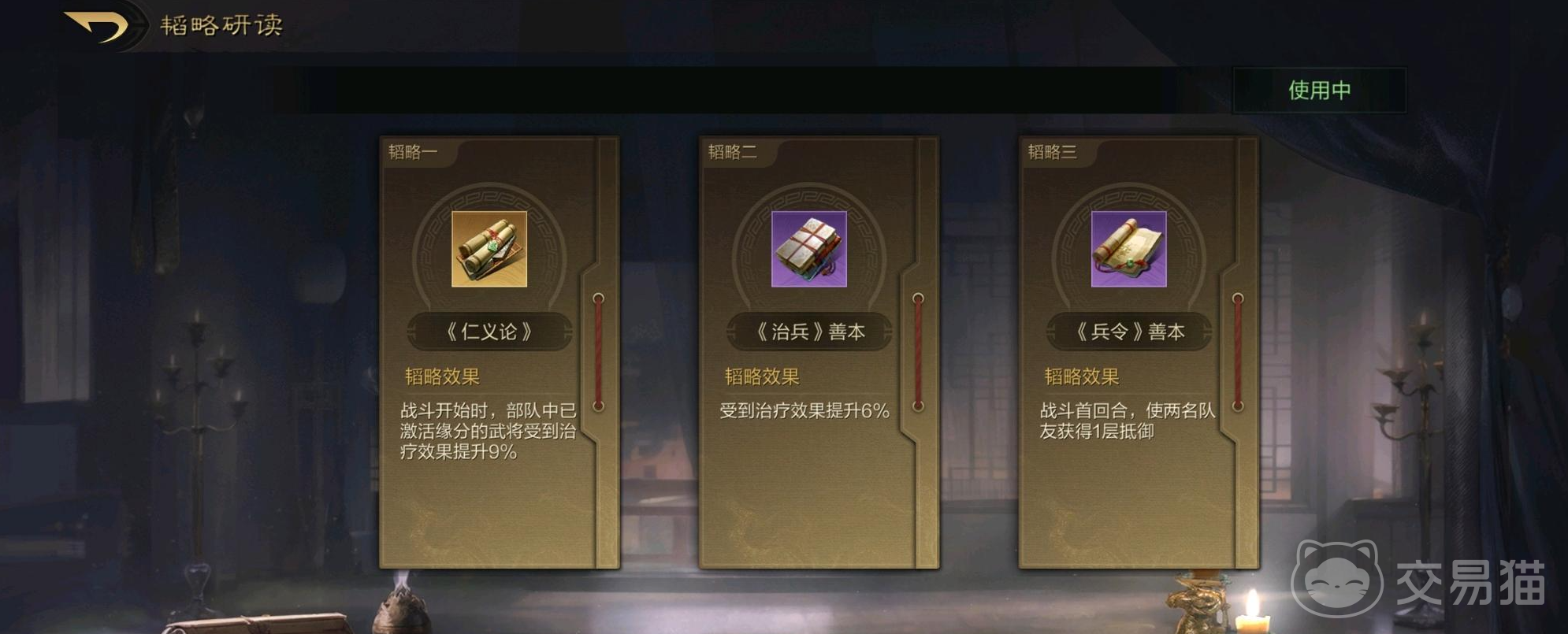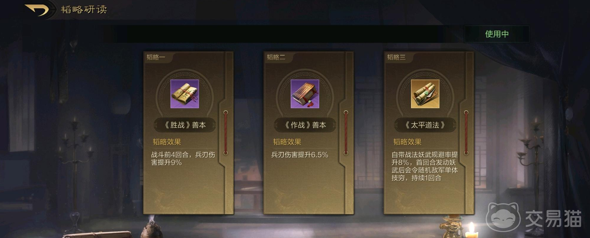有许多武将的技能是按照当前回合是奇数还是偶数来进行发动的,而紫韬略中也有不少根据回合数提供增益的,所以可以按照金韬略、武将技能和紫韬略发动的回合特性来进行韬略搭配,让技能可以最大化伤害,再搭配上有相关词条的装备,能让武将的战斗力几何倍数的上升,达到质变。