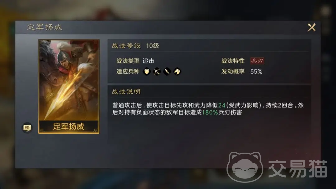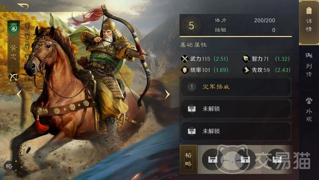 黄忠是一名橙色的弓兵武将,在队伍里主要担任后排输出的角色。他的战法名叫定军扬威,可以对敌人造成高额伤害的同时削弱敌方攻击力和先攻,同时当敌人处于负面状态的情况下下一次攻击将对敌人造成百分之一百八十的高额伤害,拥有不俗的追击能力。