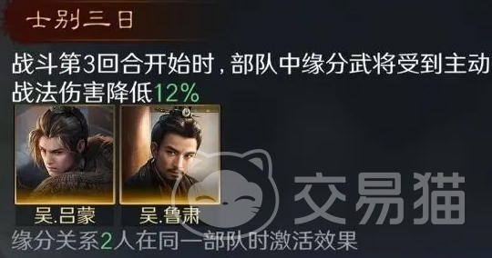 之所以推荐搭配吕蒙,是因为他能够和鲁肃触发士别三日的效果,受到的伤害会降低12%,作为全智力阵容,建议大家可去让孙权配点先攻,到时候可去优先释放料事如神,同时鲁肃去施加缴械,吕蒙则是负责持续输出,此阵容战法的发动频率和效果上都是不错的,关键就在于拥有不错的控制效果,能够为大家很好的应对绝大部分的主流战法队伍,自然也就不用担心会有输出空间小的情况发生。
