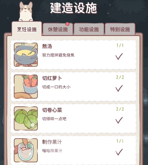 第二个套餐的意思是关于游戏里面各类菜谱。玩家们在游戏里面总共有着三大类的烹饪,首先第一个便是游戏刚开始就出现的汤,第二个则是果蔬汁,最后一个则是炒菜。后面两个则是在游戏中前期的时候会开放,玩家们只要材料满足条件便可以建造。