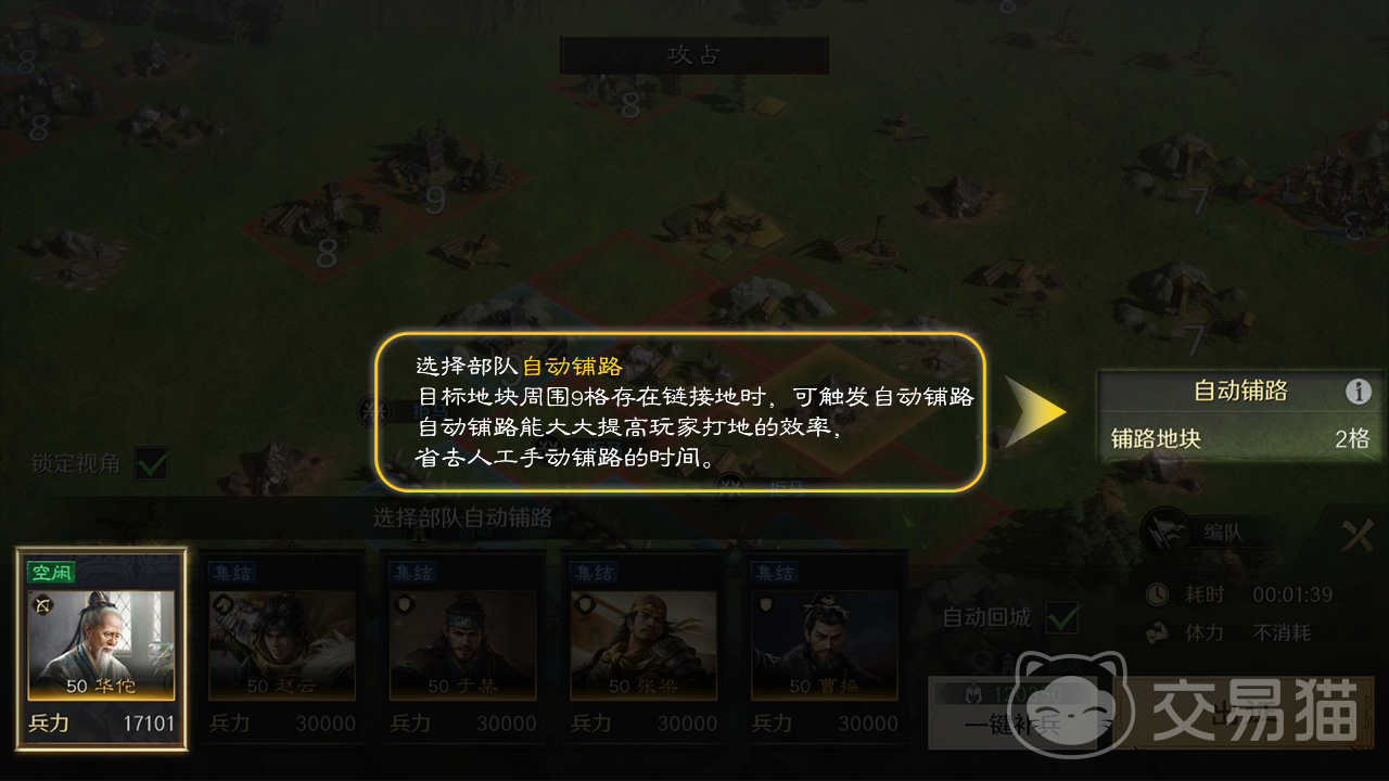 游戏铺路有两种,一种自动,一种手动。手动没什么限制,但相较来说比较麻烦,所以大部分玩家都是选择自动铺路。接下来说下自动铺路操作。玩家在确定攻打目标以后,玩家就可以选择派哪个部队去打这个地方了。选好以后系统就会为玩家自动铺路了。