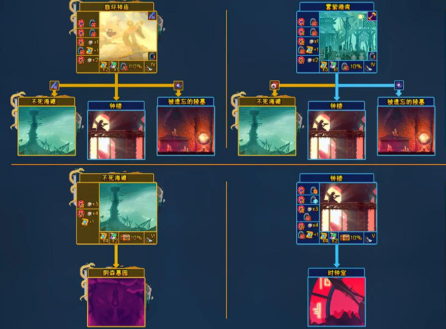 另一条路线是:牢房→下水道→古墓→古老村庄→密林→钟楼→时钟室→城堡→王座。这条路线更平滑但同样能够经过钟楼。密林则提供了丰富的资源,如隐藏的卷轴以及升级点,虽然整个路线相对资源没有什么变化,但是时钟+城堡的区域是非常好刷的,路线较为单一比较节省时间,适合装备成型之后的选择路线。