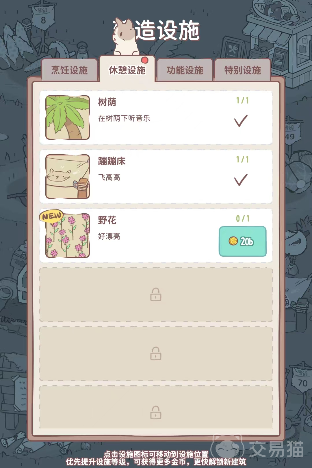 游戏中大家收集金币可以提升自己的等级,随着等级的解锁就能遇见更多的小猫咪,解锁更多的时装了,还能扩大自己的土地范围,搭建更多的建筑,吸引到越来越多的小猫咪。