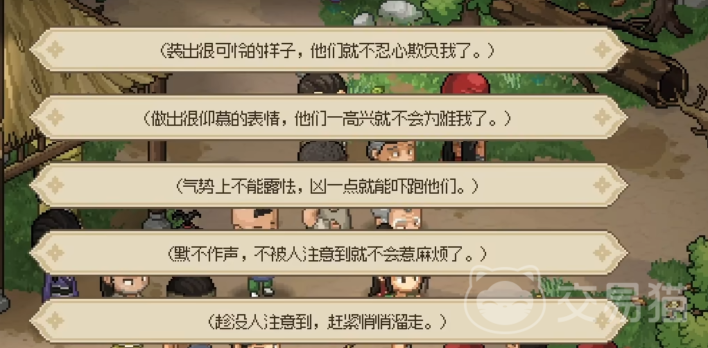 第一个选项是装可怜,这个可以让玩家们获得额外的体质+1。第二个选项则是装出很仰慕的样子,这个则是增加主角的悟性1。第三则是装腔作势,让主角的臂力可以增加1。第四个是默不作声,让主角的福缘加1。最后一个则是悄悄溜走,敏捷+1。