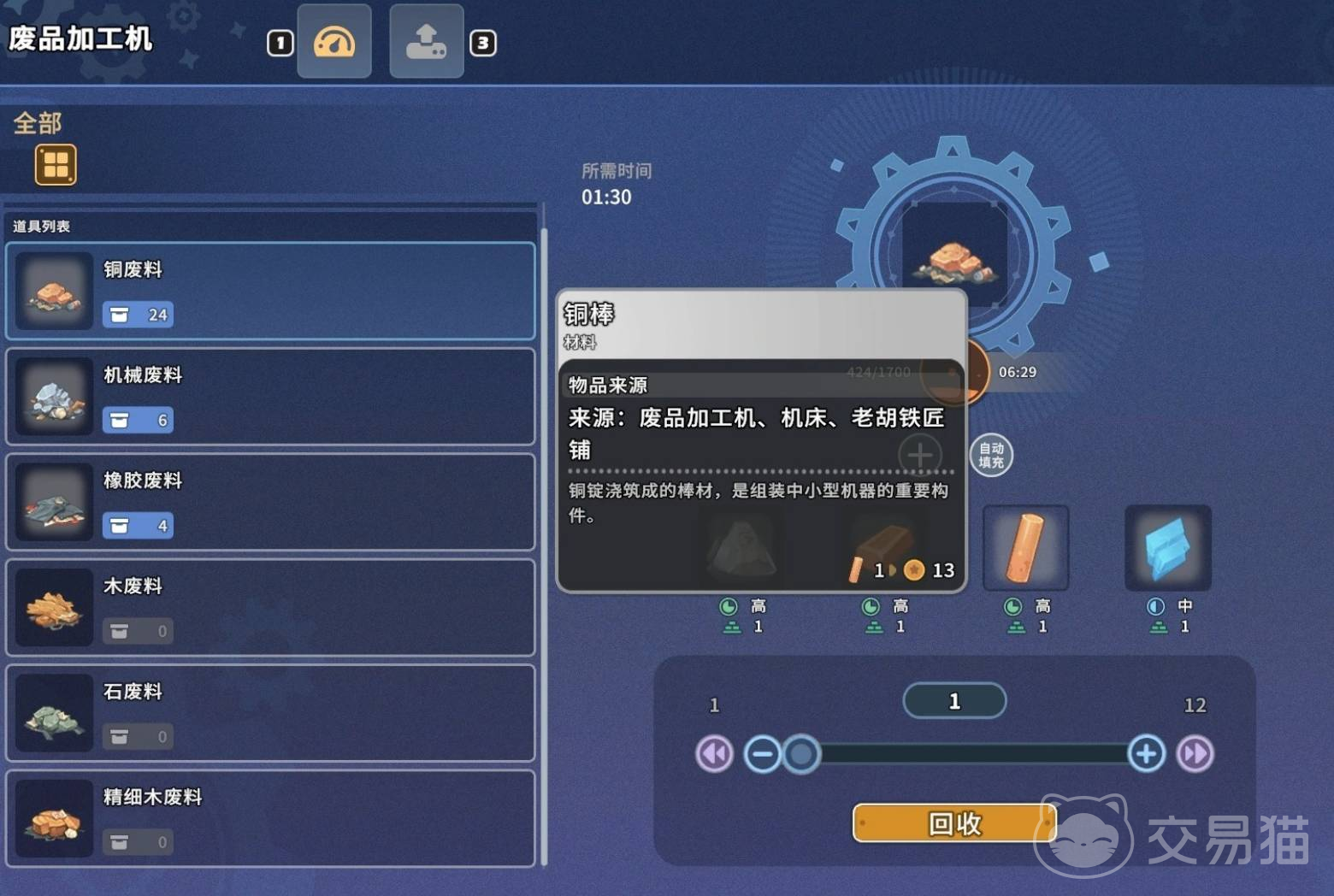 还有一个方式大家也可以去尝试一下,那就是在机床里面尝试获取一下,老胡的铁匠铺,也可以尝试从其中去获得铜棒,但是最靠谱的方式还是直接从废品加工机当中去提炼出来,数量会比较可观。