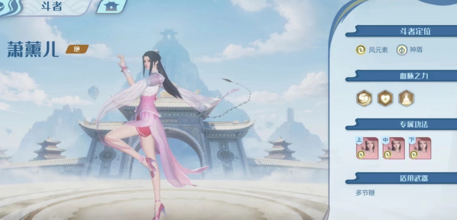 ②萧薰儿:这个角色使用的武器是一把鞭子,本身也是一位神盾职业的角色,不过她的技能风格与加刑天完全不同,其技能普遍都以输出为主,并且具有一定灵活性。